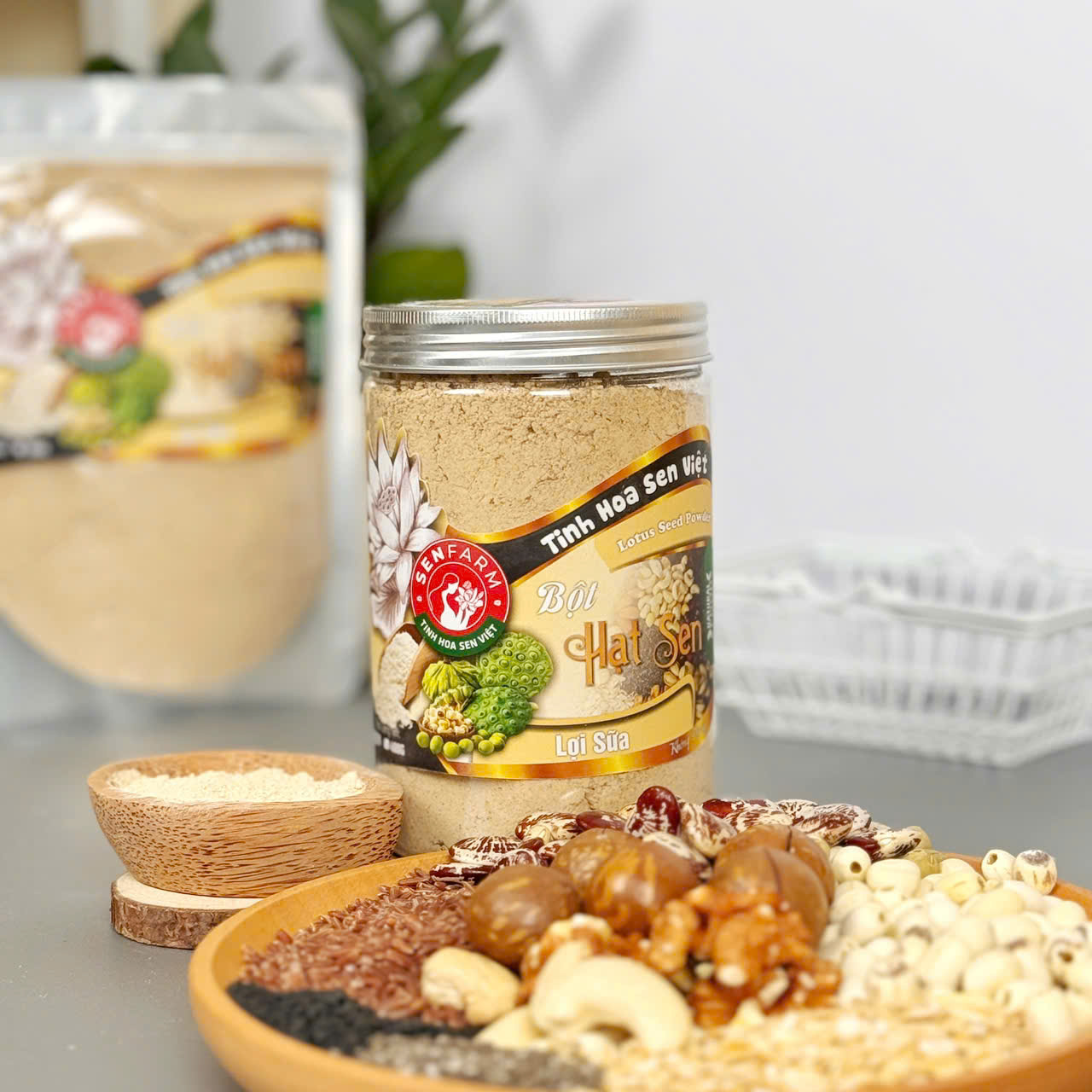 Bột Hạt Sen Hỗ Trợ Lợi Sữa Senfarm – kết hợp 8 loại hạt dinh dưỡng giúp mẹ sau sinh lợi sữa tự nhiên, phục hồi nhanh, đẹp da và cung cấp dưỡng chất cho bé phát triển khỏe mạnh. Sản phẩm thơm ngon, dễ uống, hoàn toàn từ thiên nhiên.
