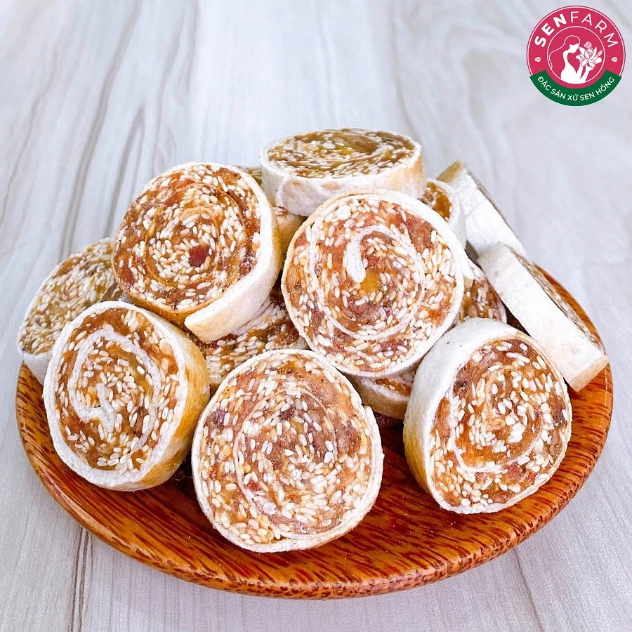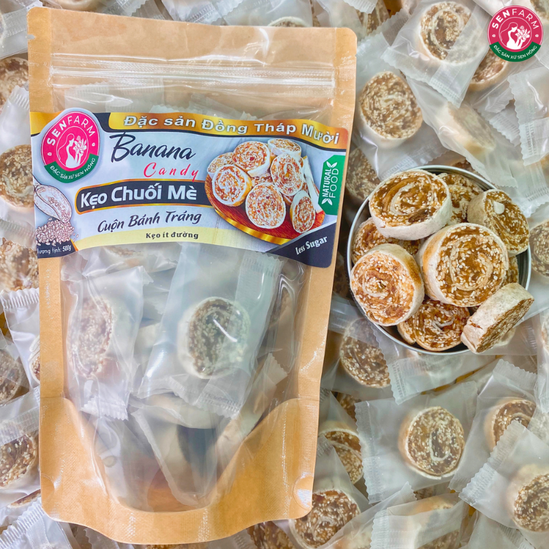Kẹo Chuối Mè Cuộn Bánh Tráng Senfarm – dẻo thơm vị chuối xiêm, béo bùi mè trắng, giòn tan bánh tráng – món quà quê ngọt ngào, đậm hương truyền thống.