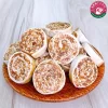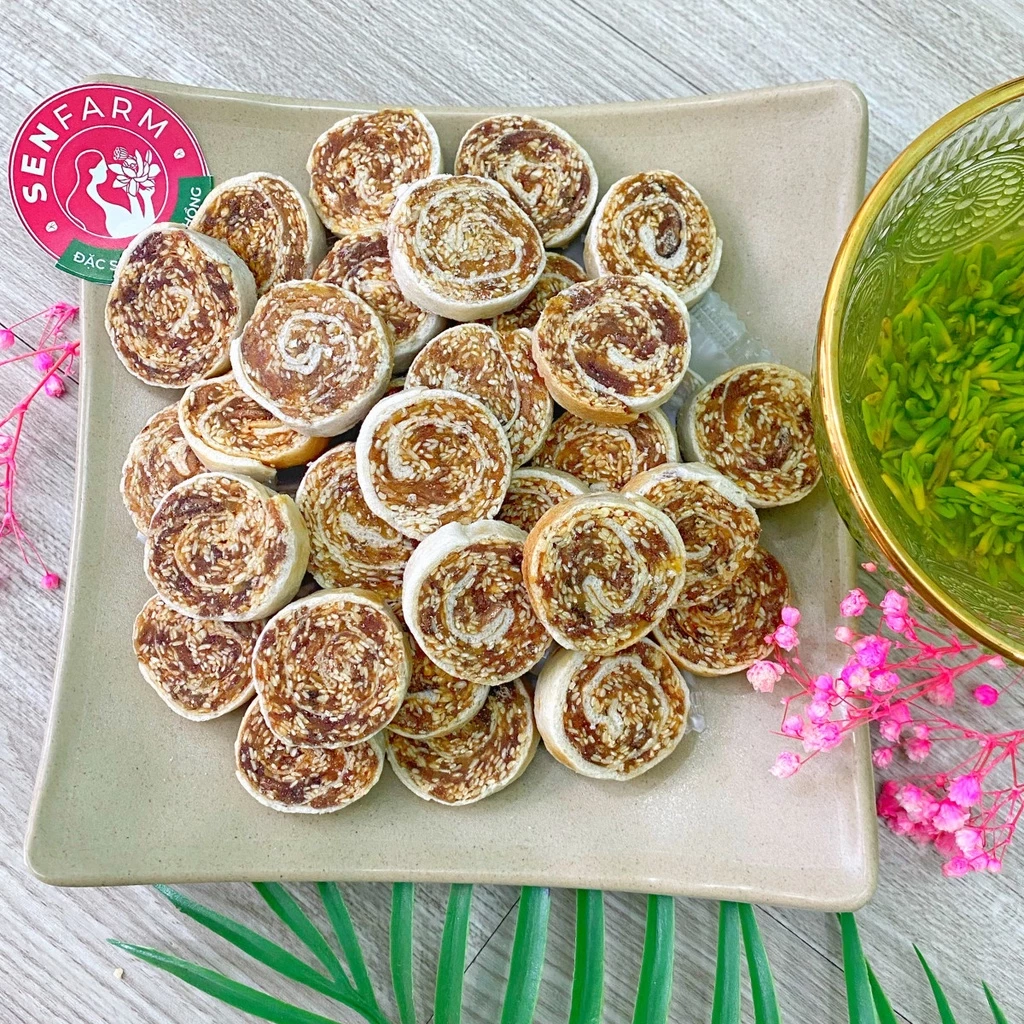 Kẹo Chuối Mè Cuộn Bánh Tráng Senfarm là món quà quê dân dã nhưng đậm đà hương vị truyền thống Việt Nam. Từng miếng kẹo được cuộn khéo léo trong lớp bánh tráng mỏng, kết hợp giữa vị ngọt tự nhiên của chuối xiêm chín, vị béo bùi của mè trắng và hương thơm nhẹ của gừng, tạo nên hương vị dẻo dai, ngọt thanh khó quên. Đây là món ăn vặt quen thuộc của nhiều thế hệ, mang đến cảm giác ấm áp và gần gũi như những ngày Tết xưa.