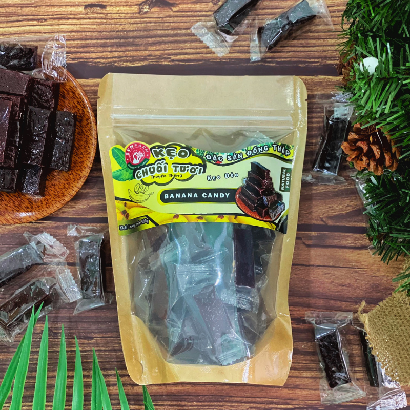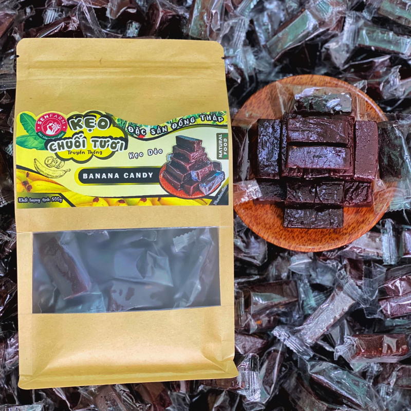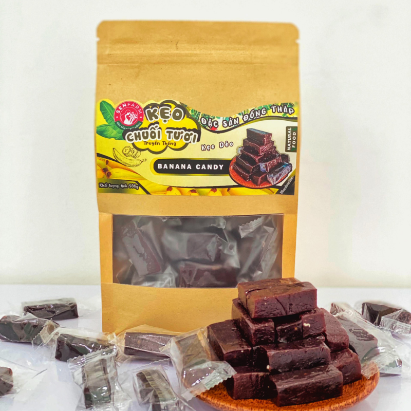 Kẹo Chuối Tươi Truyền Thống Senfarm – món kẹo dân dã được làm thủ công từ chuối chín cây, đường mía và nước cốt dừa. Hương vị dẻo mềm, ngọt dịu, béo thơm tự nhiên, gợi nhớ hương vị quê nhà mộc mạc và gần gũi.