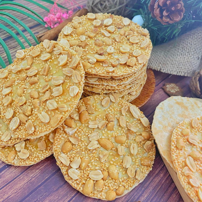 Từng nguyên liệu được chọn lọc kỹ lưỡng, đậu phộng được rang giòn thơm, mè trắng béo nhẹ, quyện cùng lớp mạch nha dẻo ngọt, tất cả được ép khéo léo giữa lớp bánh tráng khoai mì tạo nên kết cấu giòn – dẻo – bùi đặc trưng.
